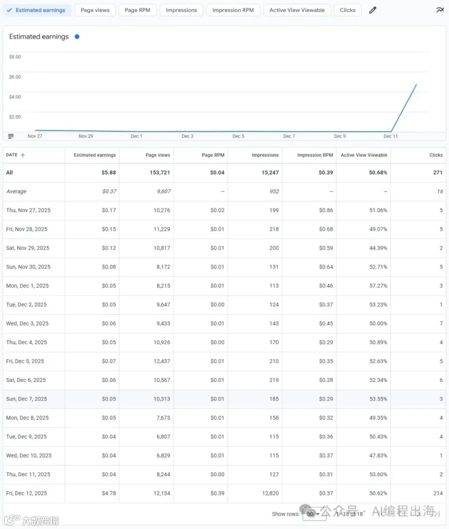 12月12日当天,Adsense广告的展现量突然从过去半月的每天一两百,一下子暴涨到12820,并产生了214次点击,当天收益从原来每天的几分钱(美金)一下子涨到4.78美金。Adsense的限制总算解除。