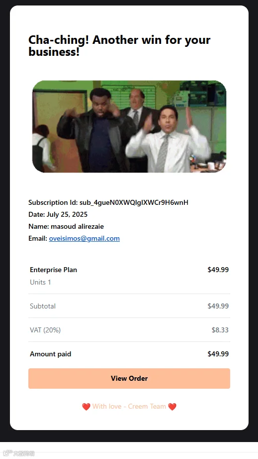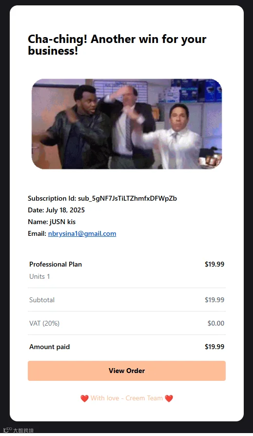 Creem对接成功后,2025年7月18日,我终于出了第一个Creem订阅订单19.99美金,随后7月25日,我出了第一个大单49.99美金: