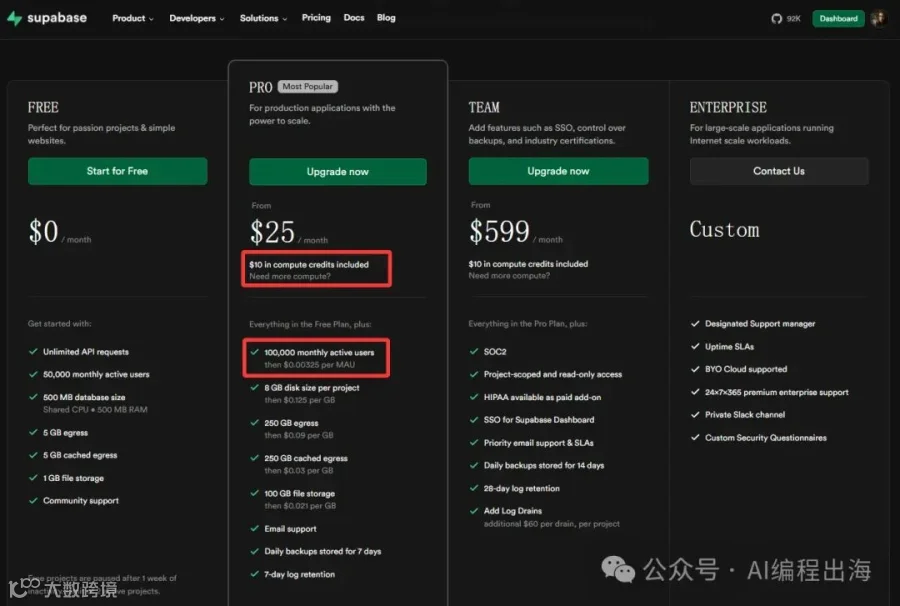 我于是回到Supabase的官方价格页面: