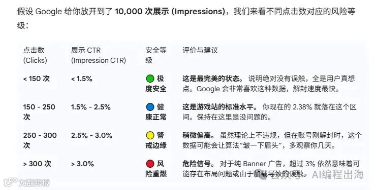 在“煎熬躺平”的半个月里,我几乎每天都会把Adsense的“Report”中最新数据情况发给Gemini做分析,确定Adsense的数据走向向好而不是进一步“高烧不退”。每次Gemini都会帮我耐心地做分析,并不断地告诫我不要乱动。过程中,我们还探讨了广告点击率(点击数/广告展现数)的概念和安全等级:
