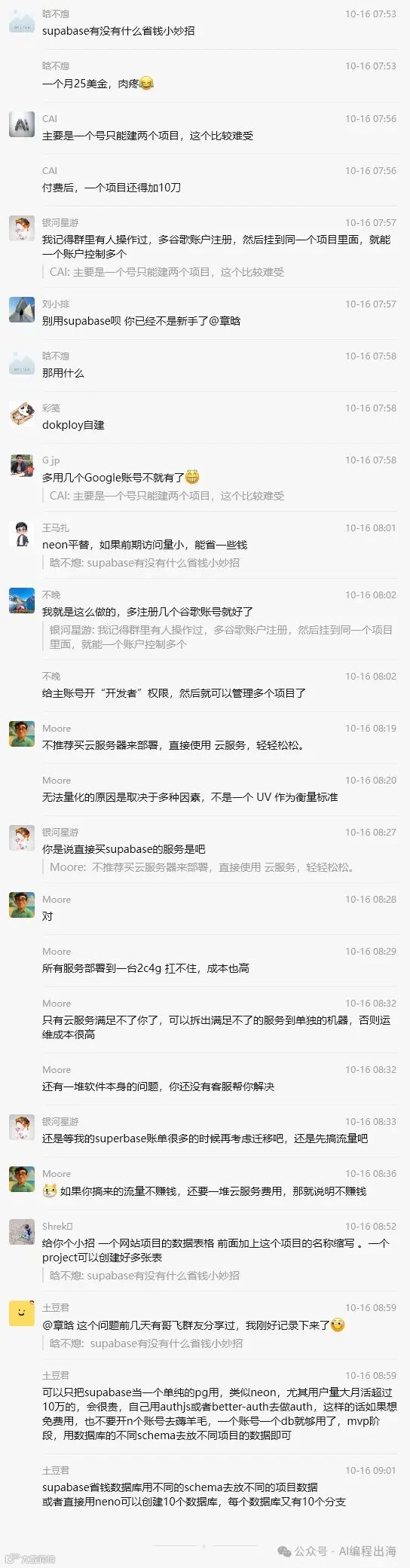 有圈友提到dokploy自建,也有圈友提到使用neon平替,还有圈友提到使用云服务...然而这些方案我目前都还没去测试过,后续测试到合适的方案一定会再和大家分享。年前在浏览生财文章的时候,刚好看到圈友彩笺的这篇文章: