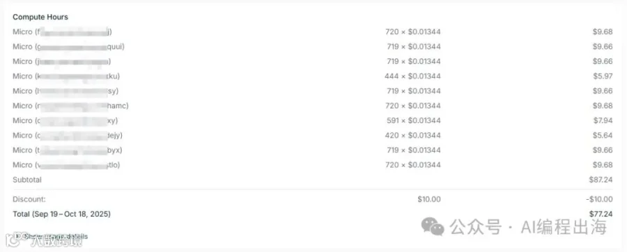 原来我那一个多月上线了8个网站,加上原来的网站,总共使用了10个Supabase数据库,每个数据库的Compute Hours使用费都接近10美金,Supabase十分友好地给我优惠了10美金,使用费一共是77.24美金。加上每月的Pro计划25美金,一共是102.24美金。虽然只是几百块,但大大超出我的预期了。