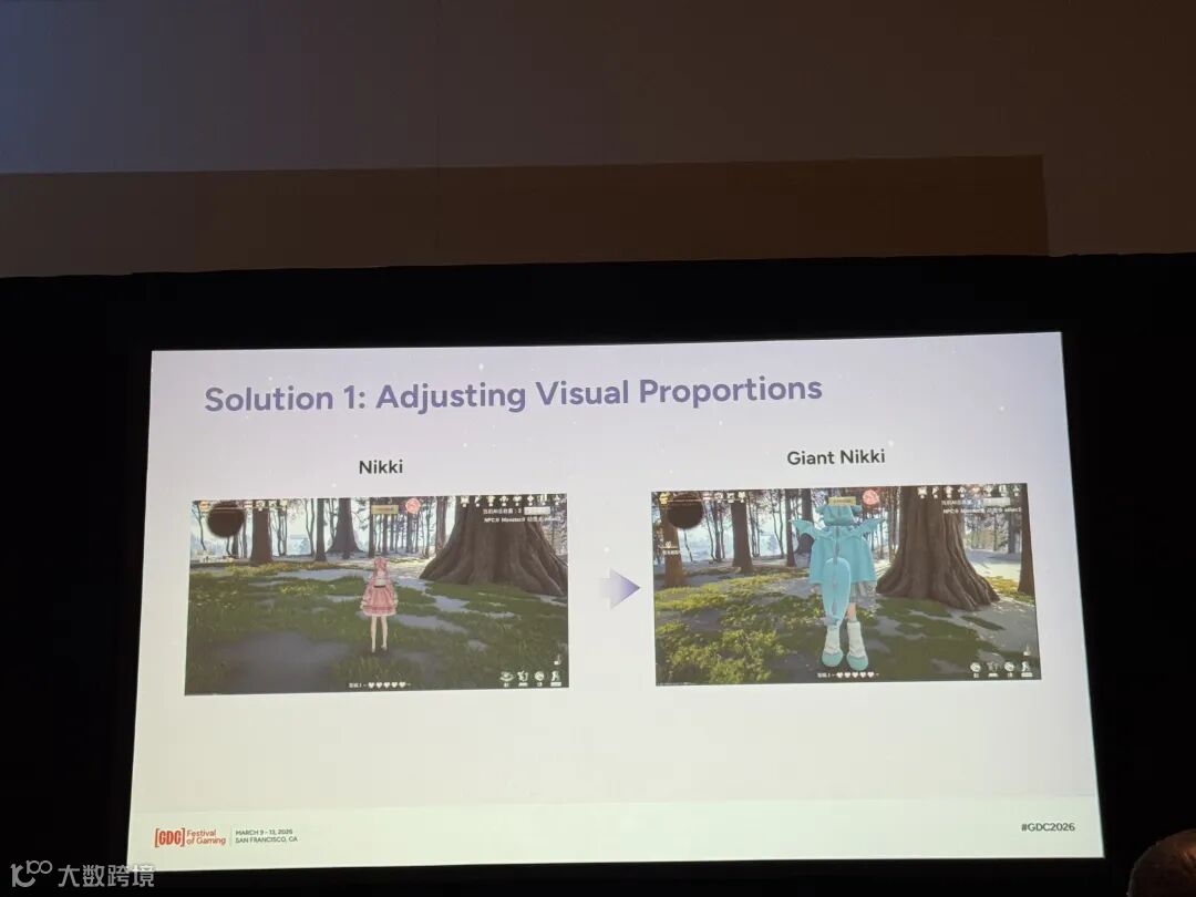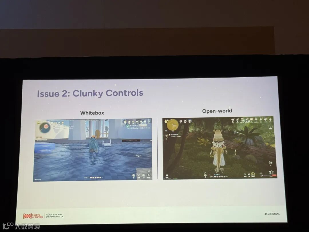 第二个问题出在操作手感上。当时大家在思考怎么强化“变大”的感受时,最开始考虑的方案是“制作变大后类似大象、熊笨重的感觉”。这样做确实让变大后的暖暖显得非常生动,但是,请大家注意,白盒关卡的地形是完全平坦的。