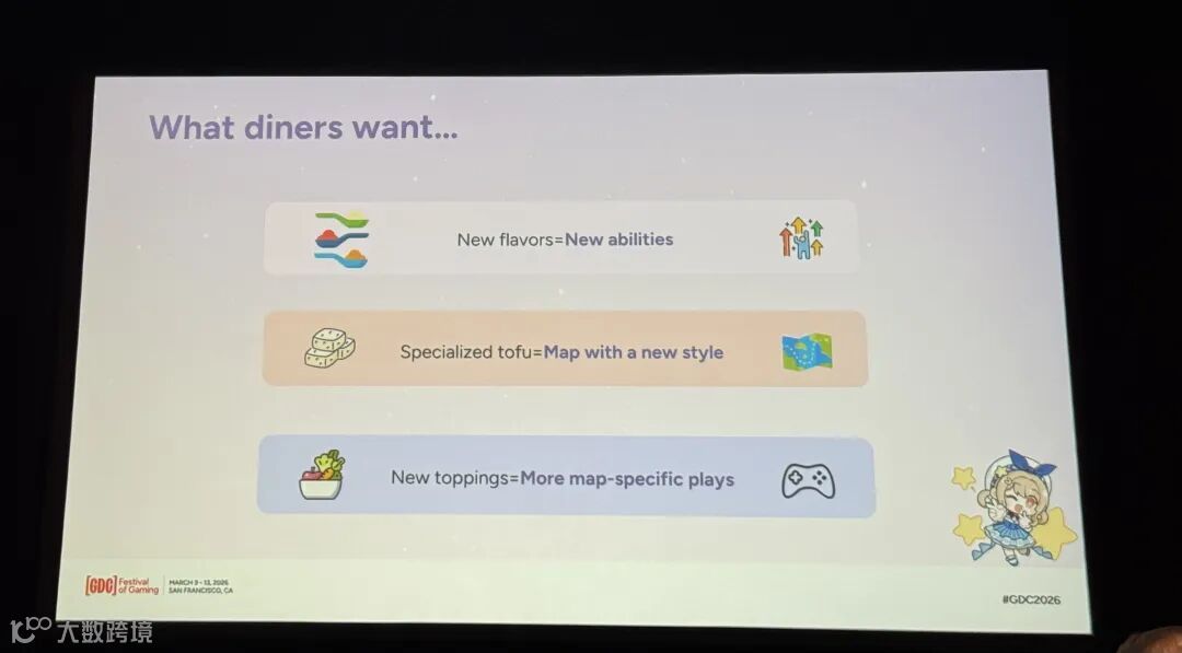食客们想要全新的风味=全新的地图能力,更有特色的豆腐=新风格的地图,丰富的配菜=更多有趣的地图玩法。