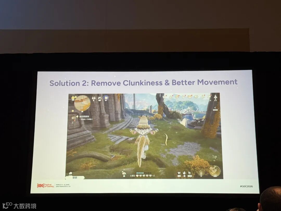 其次,去掉转向和跳跃的迟滞感,不追求完全的真实。初见的真实确实会让玩家惊艳,但考虑到我们希望变大是一个玩家长时间使用的能力,轻松的操作会更合适一些。修改后,大暖暖拥有和普通暖暖相同的跳跃手感,以及更强的越障能力。