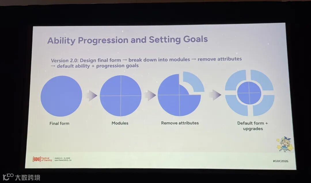 首先,我们依然跟1.0版本一样,在最开始就进行了完全体能力的设计。在此之后,我们将完全体能力从体验的维度梳理出了一些模块,再从这些模块中区分出一些体验,于是就得到了初始能力和玩家养成目标。也是就图中的蓝色和粉色块。