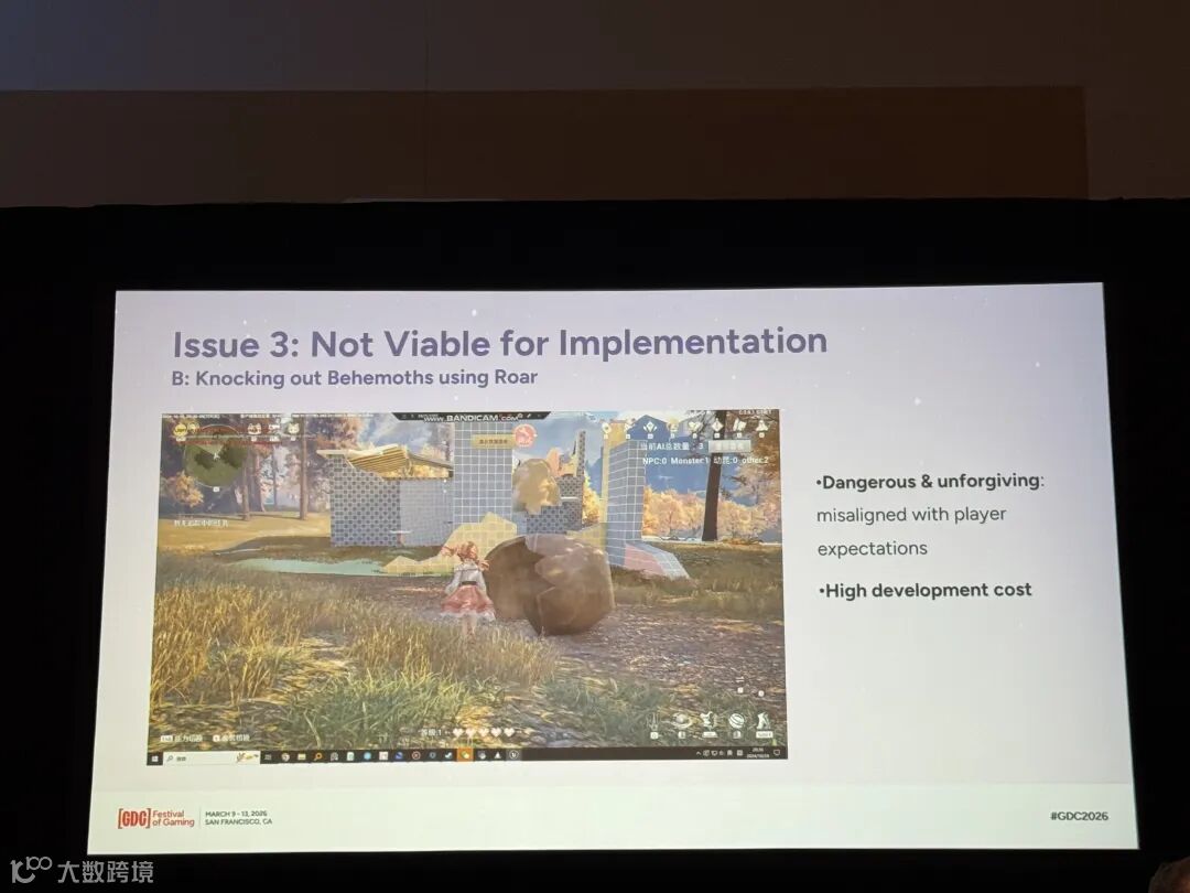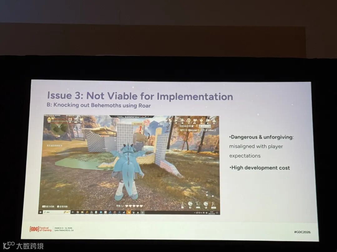 第三点是能力衍生玩法的落地问题。在最初的设计中,变大玩法主要围绕两个体验展开:“涉水”和“吼晕巨兽”。