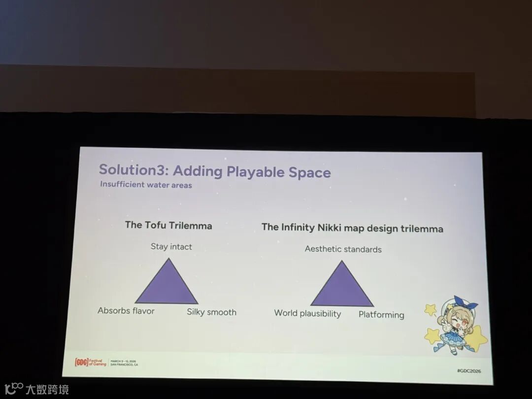 最后是解决能力应用环境。先说水域面积小的问题,这件事会关系到我们的主菜:也就是地图。我们不能让一块豆腐同时具备“形态稳定-易入味-口感滑嫩”的特性。我们暂时也无法让地图设计同时满足“美学追求-世界合理性-平台跳跃功能性”这三个点。