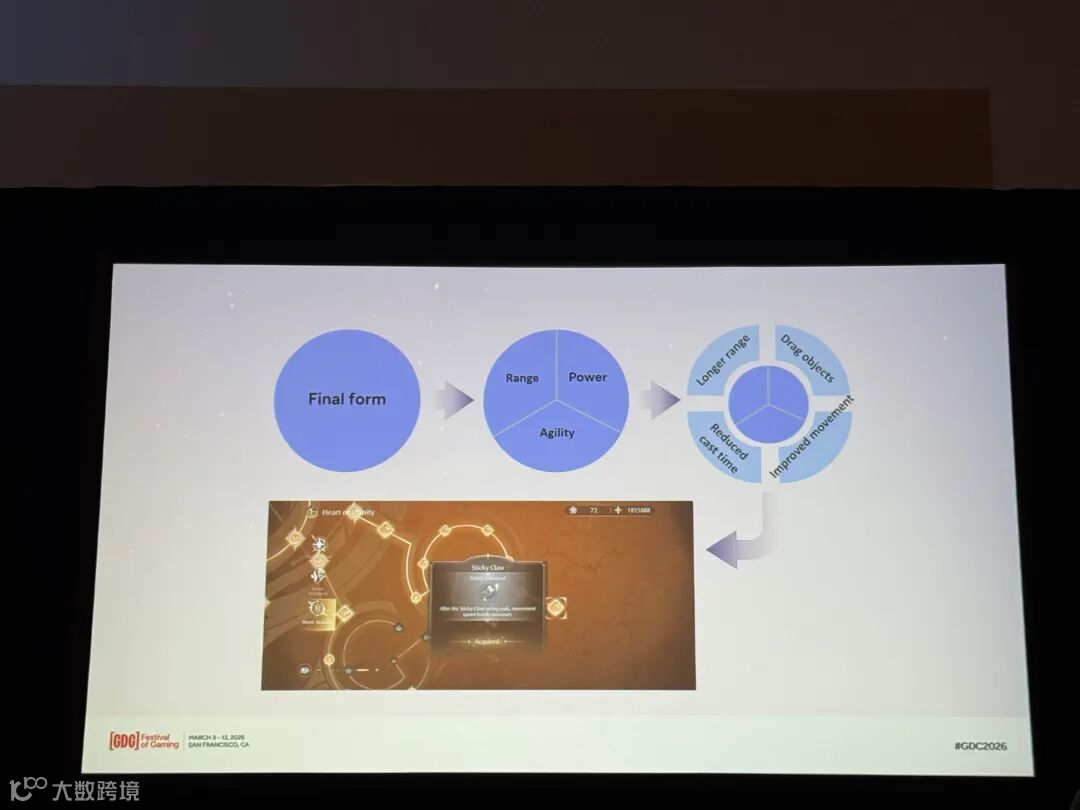黏黏爪是一个更纯粹的能力,它的可养成维度会少一些。于是我们梳理了三个模块“发射距离”“力量”和“灵活性”。之后是跟变大一样,区分一些体验,最后得到一批养成目标。