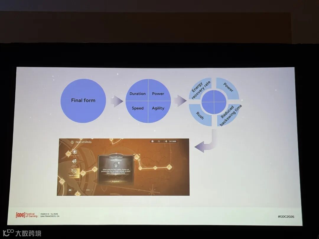 比如变大,我们一开始是想把变大后的移动速度,以及变大后消耗的能量槽的回复,两个要素都拿出来拆了做养成。但后来发现如果这两个都拿出来做养成的话,其中一方会变得不可控,因为玩家实际变大后,这两个变量是结合在一起来影响玩家跑多远这件事的,拆开养成,玩家到底能跑多远,这个要素就不好控制了。