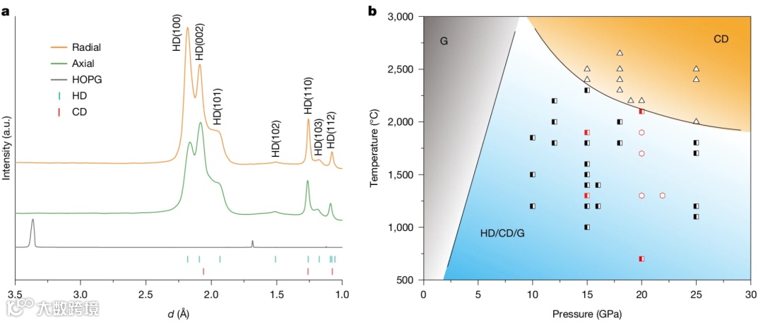 研究团队改造合成腔体,实现沿石墨c轴方向的单轴应力增强与横向压力削弱,有效抑制横向滑移。碳原子只能按ABAB…方式垂直堆叠,从而定向生成六方结构。