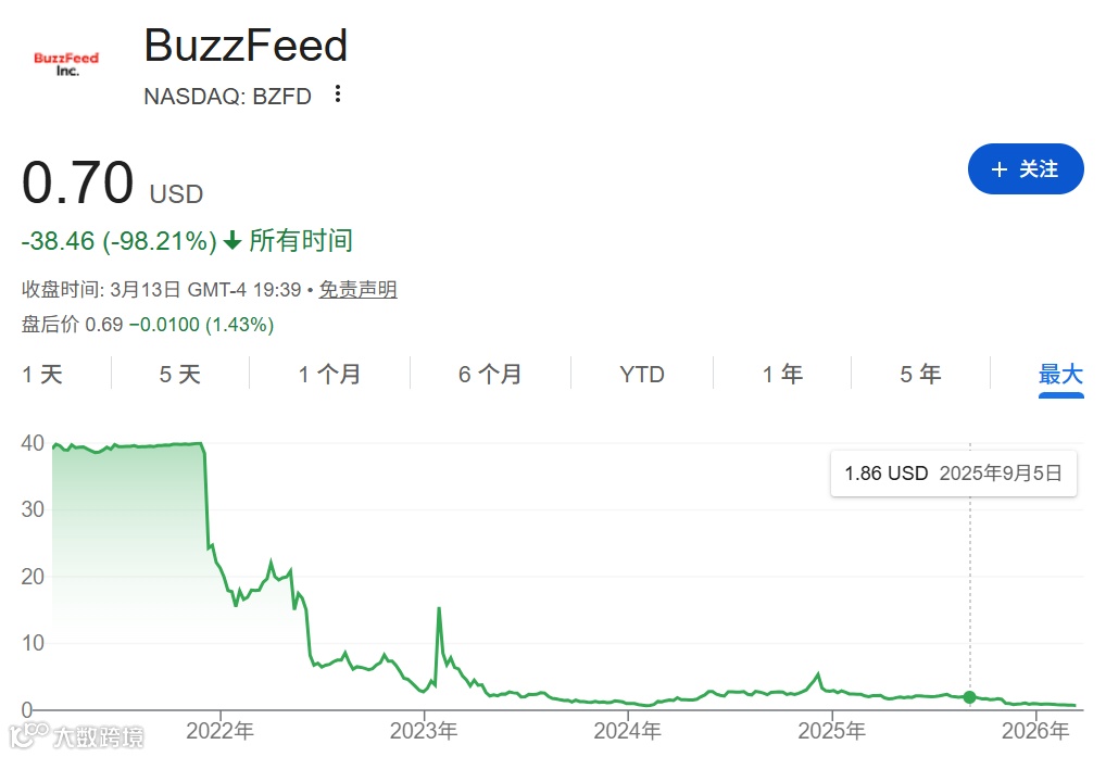 截至2026年3月,BuzzFeed市值已从2016年巅峰期的17亿美元暴跌至约2600万美元,跌幅超98% [7] 。公司已关停新闻部、遣散编辑团队、贱卖核心资产,并转向AI驱动的自动化内容矩阵,试图以极端降本增效维持运营。