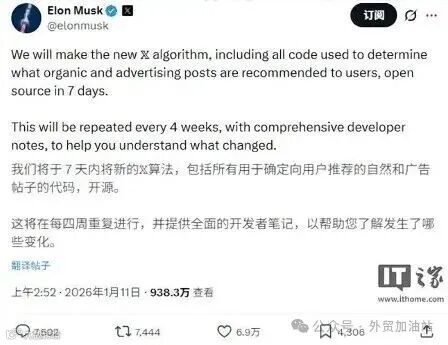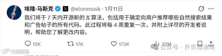 马斯克在X平台宣布,将在7天内开源其内容推荐算法,覆盖所有决定自然内容与广告内容推荐的代码,并计划每四周更新一次,同步发布开发者说明。此举被市场解读为“马斯克也要涉足GEO”。