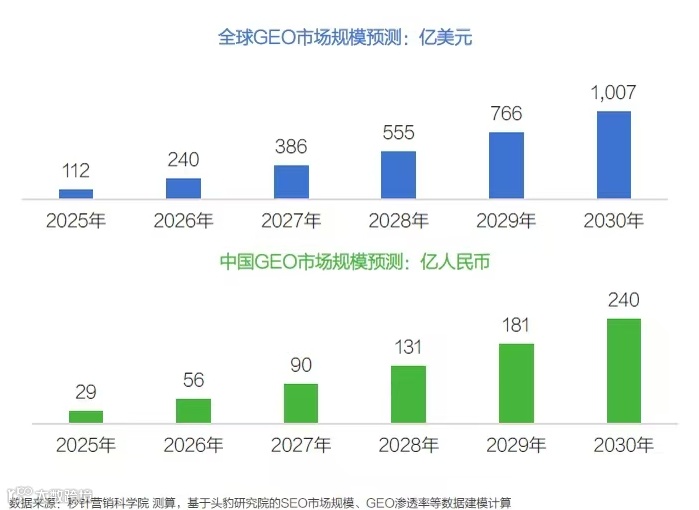 据国泰海通证券报告,2025年全球GEO市场规模约112亿美元,预计2030年达1007亿美元,CAGR约55%;中国GEO规模2025年约29亿元,2030年预计达240亿元,CAGR约53% [5] 。