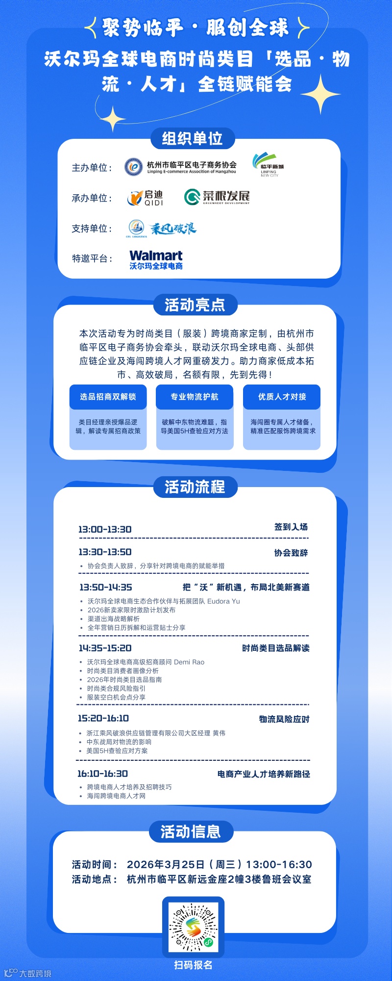 3月25日,“聚势临平▪服创全球——沃尔玛全球电商时尚类目「选品·物流·人才」全链赋能会”专为你们量身定制,一站式解决你的增长难题!
