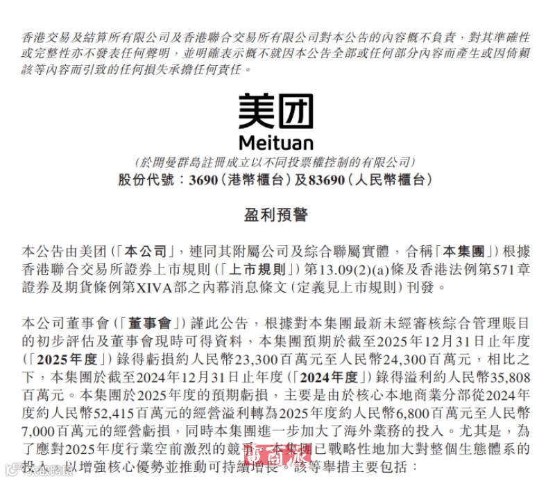 此前,美团在港交所发布业绩预告显示,2025年全年预计亏损233亿元至243亿元,该亏损态势将在2026年第一季度延续。