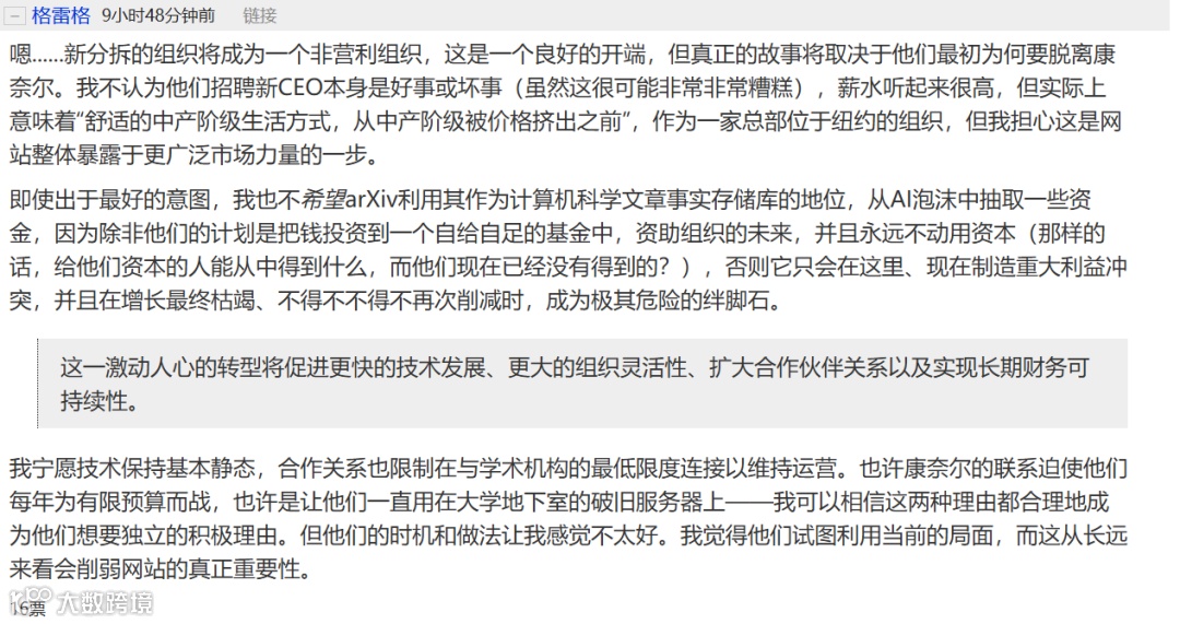 转型也伴随审慎讨论。部分用户担忧独立可能导致体验下滑或偏离公共服务定位;另有观点强调,非营利组织的法定宗旨正是服务公共利益。值得注意的是,在AI训练数据价值凸显背景下,arXiv 作为计算机科学核心论文库,其潜在商业用途引发警惕——有用户直言:“不应借AI热潮谋取短期收益,除非所得全部注入永久性捐赠基金并严控本金使用”。未来是否与科技企业合作,将直接影响其学术中立形象,尚待观察。