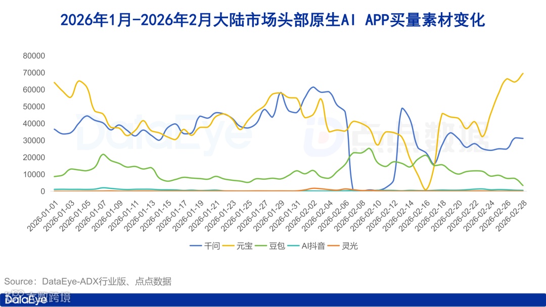 截至2月底,元宝日投放素材量逼近7万组,千问则维持在3万组左右。