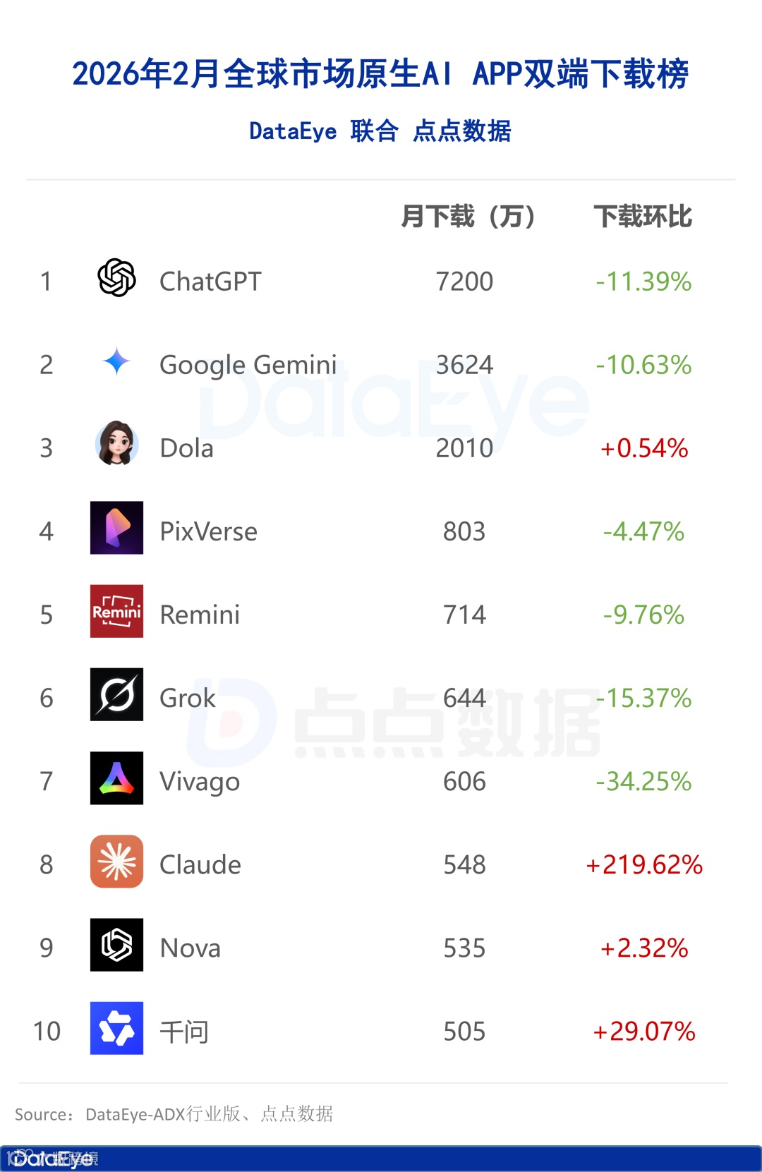 点点数据显示,2026年2月,全球(含中国大陆)原生AI APP苹果App Store与谷歌Google Play双端预估下载总量达