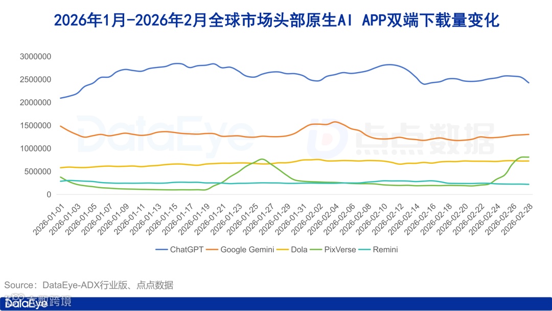 点点数据显示,2026年1月至2月,全球市场头部原生AI APP中,ChatGPT双端预估下载量大幅领先同类产品,Google Gemini紧随其后,不过值得注意的是这两款头部产品2月份下载量均出现明显下滑。