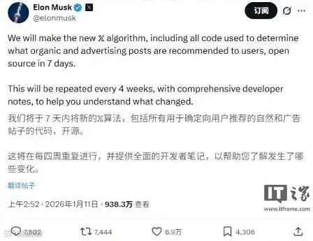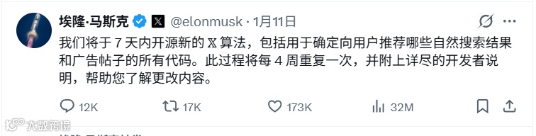 马斯克在社交媒体平台X发文称,将在一周内正式开源X平台最新的内容推荐算法。本次开源将覆盖“所有用于决定向用户推荐自然内容和广告内容的代码”,并强调这只是第一步。后续将每四周更新一次代码,同时附带开发者说明,标注算法和逻辑上的改动内容。这一举动被市场普遍解读为“马斯克也要涉足GEO”。