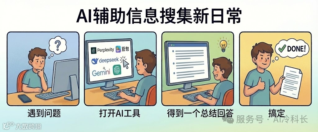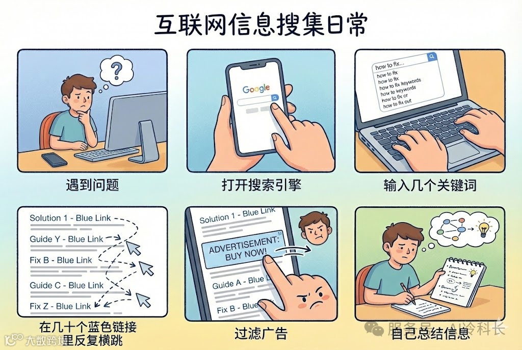 遇到问题 → 打开搜索引擎 → 输入关键词 → 几十个蓝色链接里反复横跳 → 过滤广告 → 总结信息