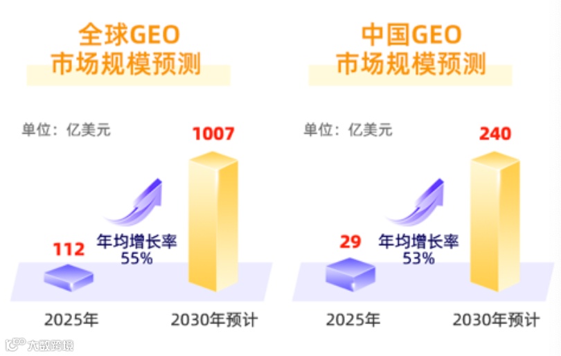 据第三方机构数据统计,2025年全球GEO市场规模约112亿美元,2030年预计达1007亿美元,2025–2030年CAGR约55%;中国GEO规模2025年约29亿元,2030年预计240亿元,CAGR约53%。