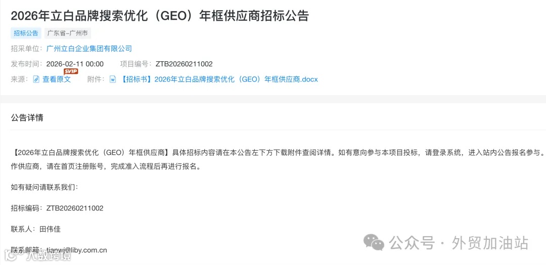东阿阿胶与立白集团同步推进 GEO 优化项目,前者聚焦产品信息在 AI 工具中的结构化呈现,后者启动“GEO 搜索优化年框供应商”遴选,均体现 GEO 已从单点试点迈向常态化运营阶段