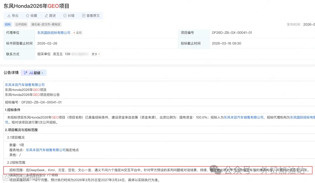 东风 Honda 于 2026 年 2 月 13 日启动 GEO 项目招标,目标是在 DeepSeek、Kimi、元宝、豆包、文心一言、通义千问六大 AI 交互平台中,针对预设问答场景,持续稳定地向用户推荐四款指定车型,服务期不少于 1 年,投标截止时间为 3 月 16 日