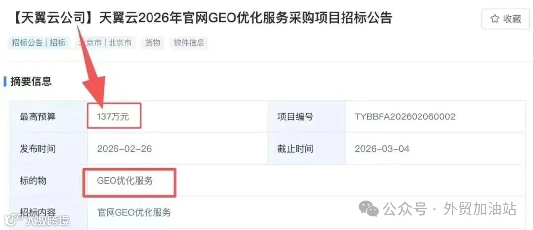 天翼云于 2 月 26 日发布 2026 年官网 GEO 优化服务采购招标,预算上限 137 万元,旨在提升官网在 AI 检索场景下的内容识别度与权威引用率,投标截止日为 3 月 4 日