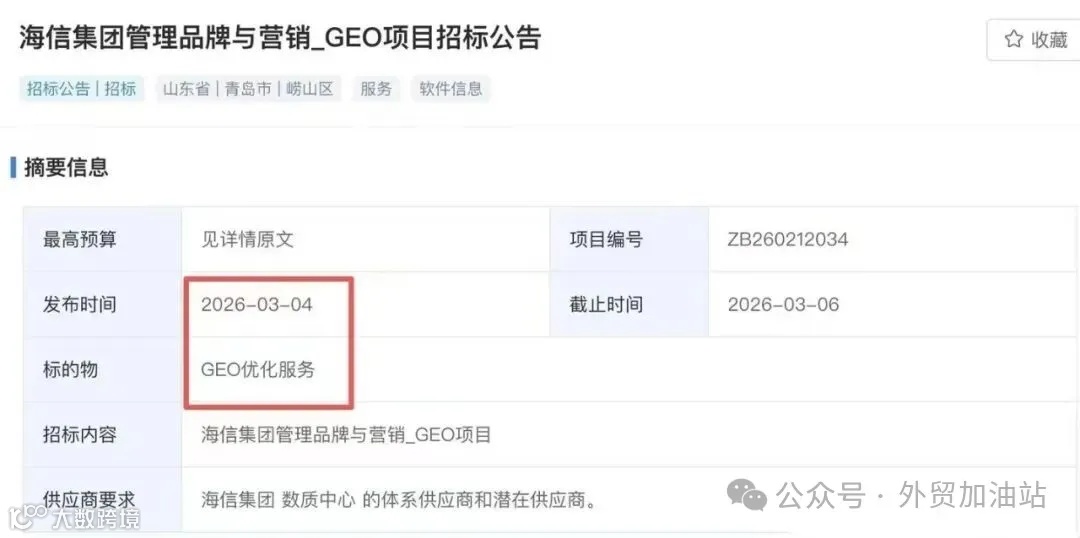 海信集团于 3 月 4 日发布“管理品牌与营销_GEO 项目”招标,面向数质中心体系及潜在供应商,聚焦品牌及营销类内容的 AI 场景适配性优化,投标截止日为 3 月 6 日