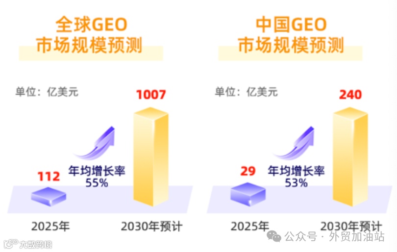 据国泰海通证券数据,2025 年全球 GEO 市场规模约 112 亿美元,预计 2030 年达 1007 亿美元,CAGR 约 55%;中国市场规模同期将由 29 亿元增长至 240 亿元,CAGR 约 53%