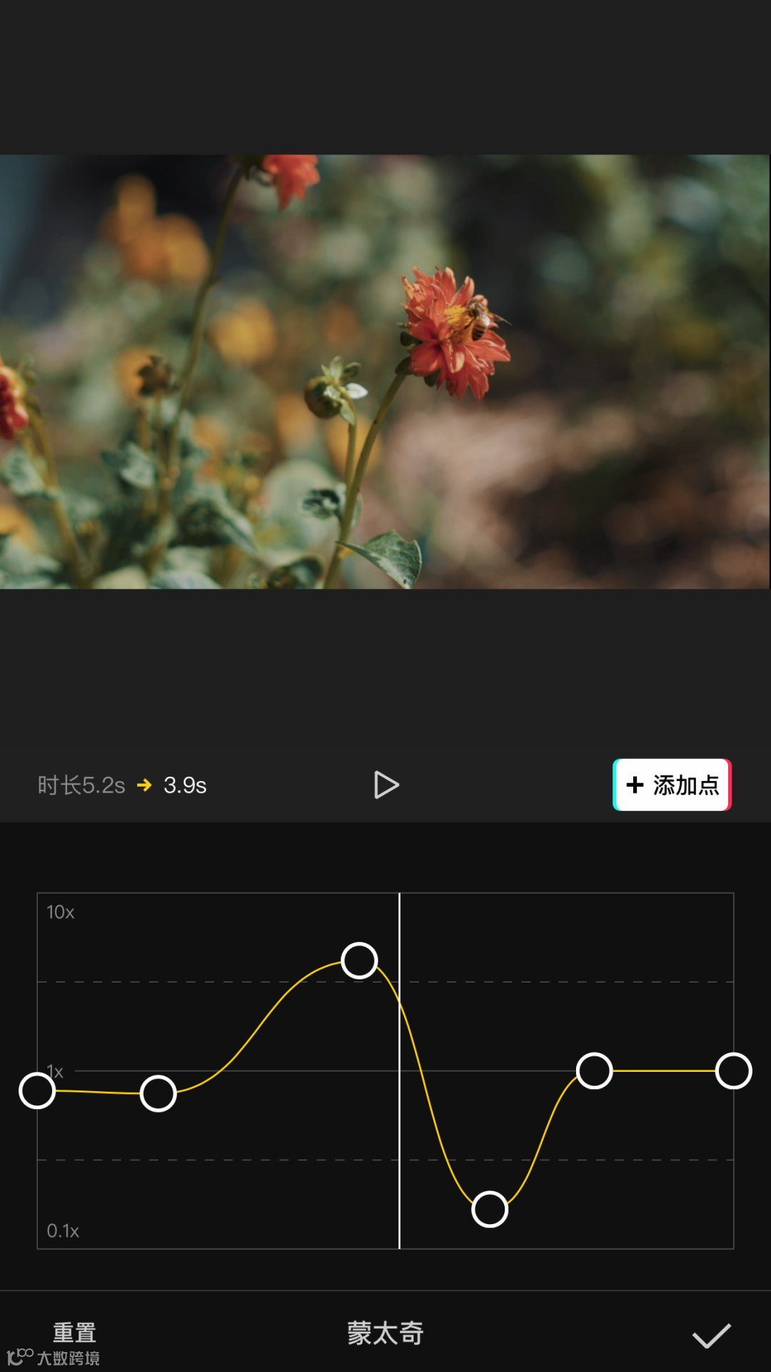 常规变速(0.1x–100x)实现快慢放;曲线变速提供蒙太奇、英雄时刻、子弹时间等预设效果,支持自定义速度点调节。
