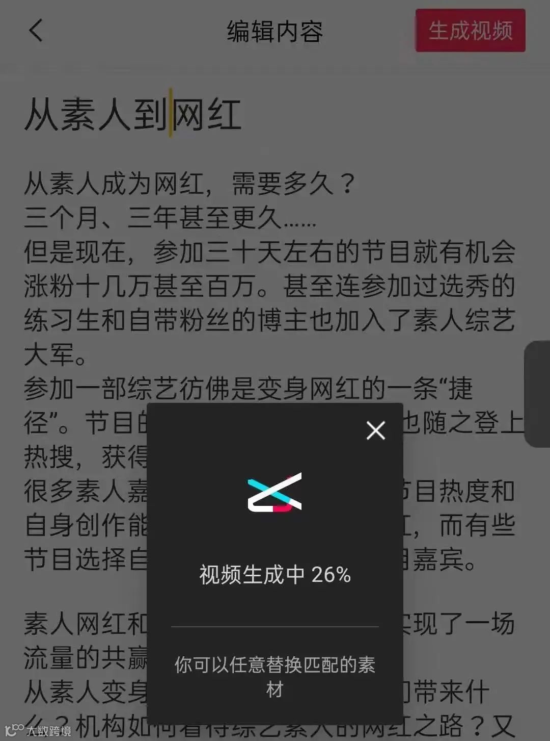 输入文字,系统自动匹配画面、音乐与转场生成视频初稿,支持后续精细化调整。虽便捷高效,但建议结合自主剪辑以保障内容个性与质量。