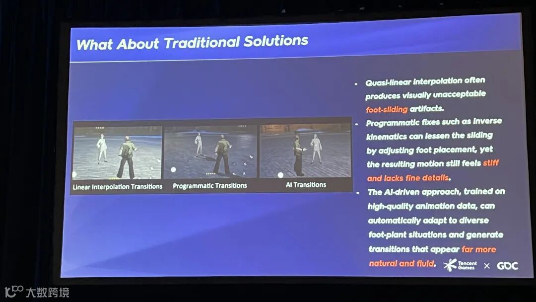 在最终的效果对比中可以看到,对于大位移运动(如从滑步到奔跑的过渡),传统方案会生硬地切入转身,而AI模型能自然流畅地转身,同时毫不牺牲玩家操作的响应速度。
