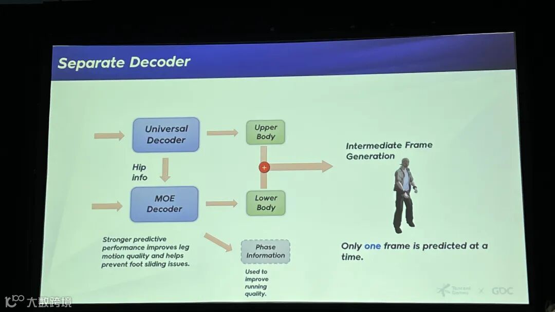 我们还使用了分离的解码器:一个是MoE(混合专家)解码器用来生成中间帧,并且把上半身和下半身的解码器也分开了。这种设计让模型对下半身有更强的预测能力,有效防止了滑步。