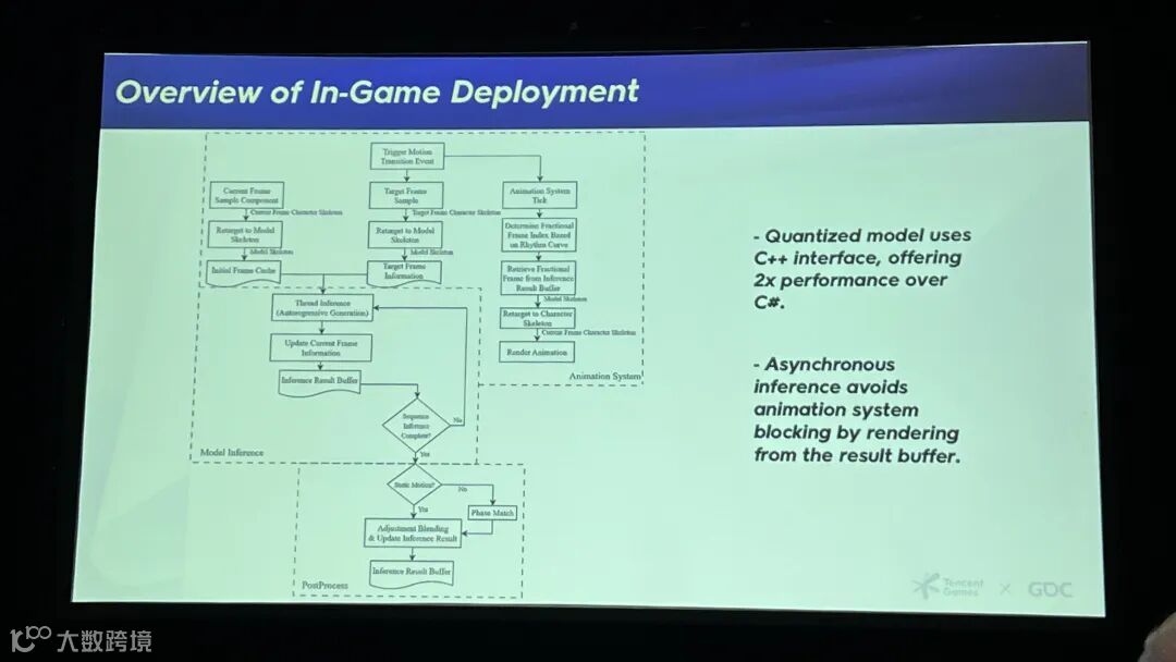 在游戏内引擎部署方面,量化模型我们使用的是C++接口。异步推理意味着我们直接从结果缓冲区进行渲染,动画系统完全不会被阻塞。我们通过偏移运动处理来解决根骨骼的方向和空间变化。