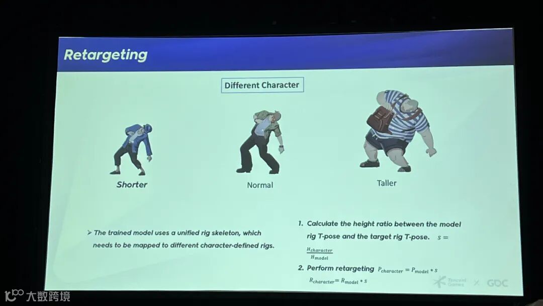 关于模型对不同角色骨架(Rig)的重定向问题:模型其实是在统一的骨架上训练的,我们通过计算模型T-pose和目标T-pose的身高比例,将其映射到每个角色的骨架上,并按此比例自动缩放位置和旋转。因此,我们无需重新训练,就能支持正常体型、较矮或较高的各种角色。