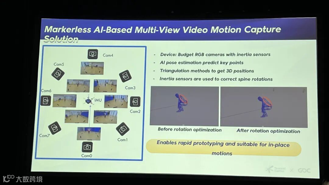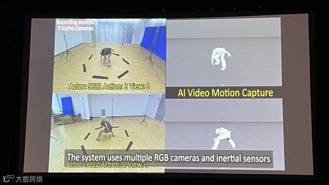 在数据获取方面,传统的动捕需要大型影棚和昂贵的设备,还要在演员身上贴满马克点。现在,我们在一个小房间里,仅仅使用七台像GoPro一样的普通摄像头就能达到同样的目的。