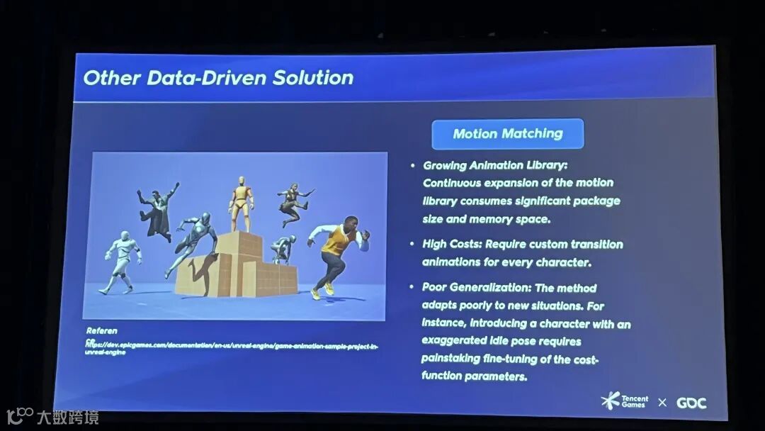 而运动匹配(Motion Matching)等数据驱动方案也有明显局限:它需要一个极其庞大的动画库,特别吃内存;还得为每个角色定制过渡动画;而且泛化能力很差,遇到夸张的待机姿势就需要大量微调。