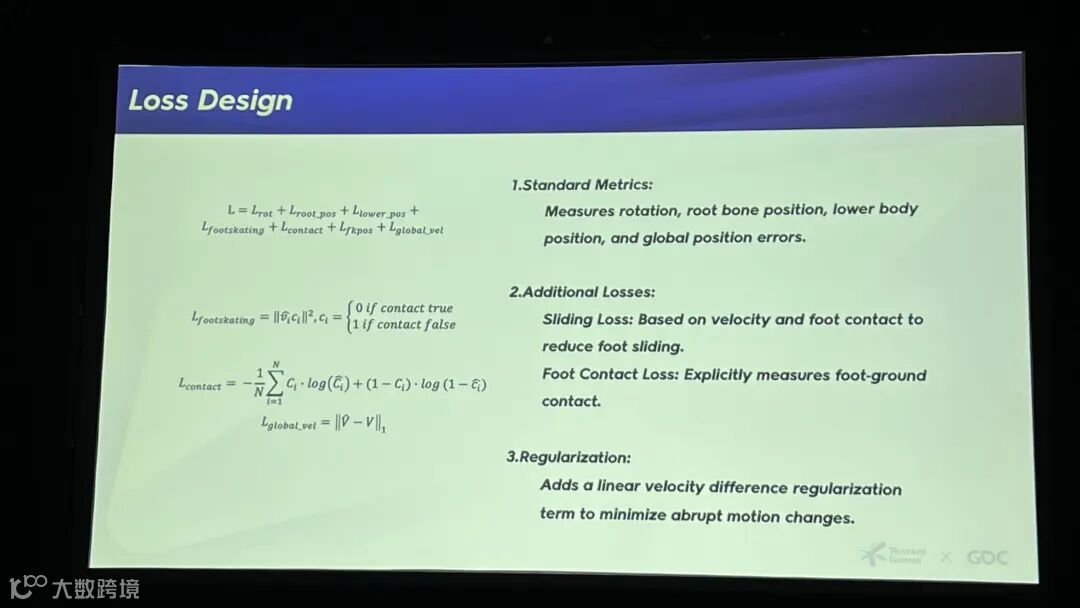 在损失函数上,除了旋转、根骨骼位置等标准指标,我们还特别加入了基于速度和接触的滑步惩罚以及脚步接触惩罚。