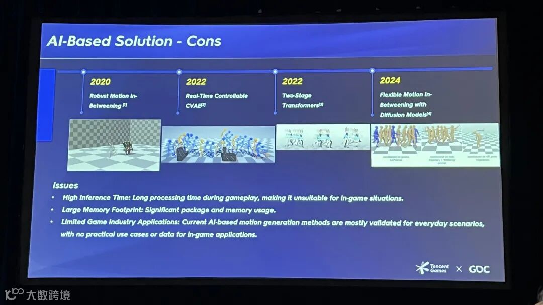 AI方案,如鲁棒的动作补帧、CVAE、双阶段Transformer及基于Diffusion的方法等,能很好地泛化到各种姿势,生成流畅、自然且符合物理法则的动作。
