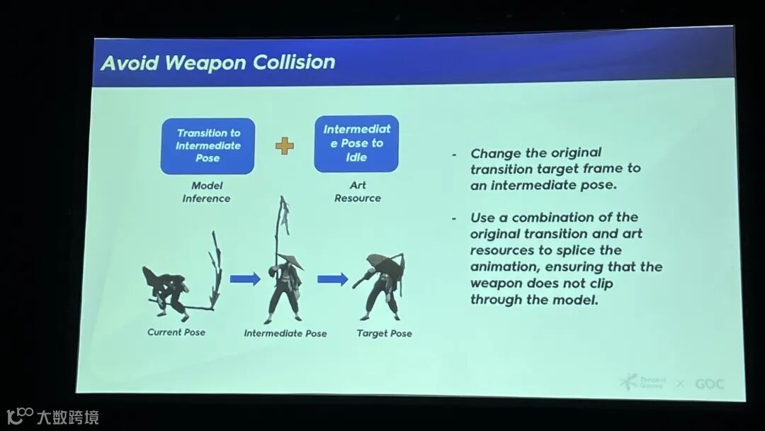 武器穿模(Weapon clipping)是游戏动画中最让人头疼的问题之一。为此,我们改变了原始的过渡目标,将其设为一个中间姿态,然后结合AI生成的过渡帧与IK资源来调整动画,成功防止了武器穿透角色身体。