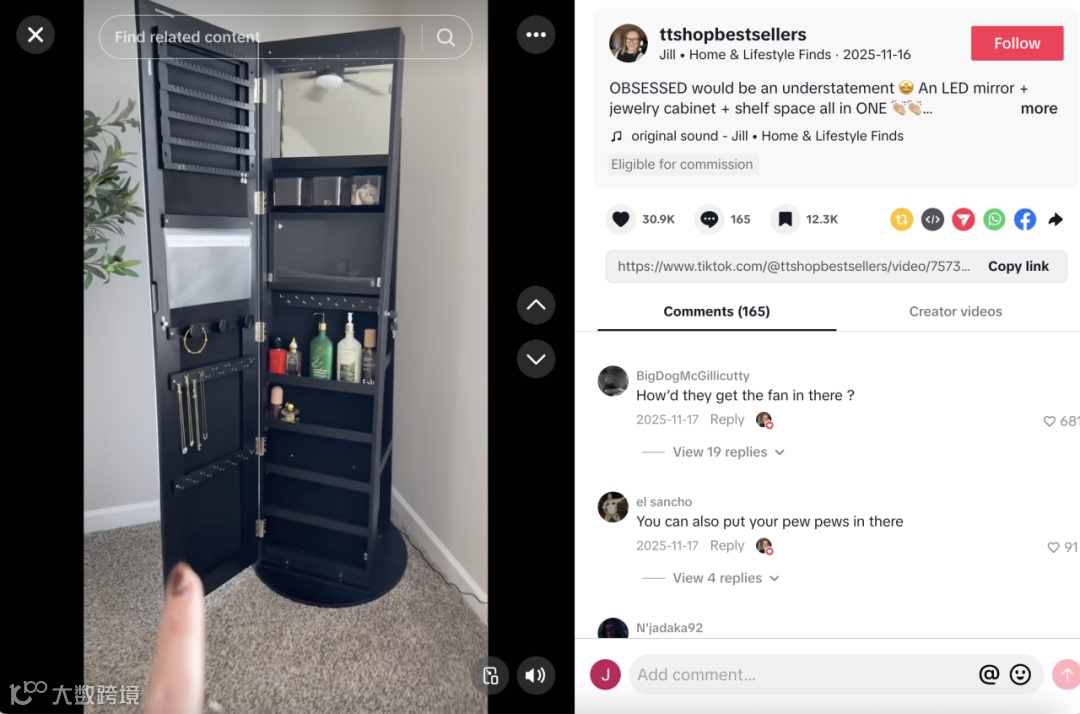比如,其合作的TikTok生活方式尾部博主@ttshopbestsellers,粉丝量仅8k,但博主推荐的带收纳功能LED全身镜视频曝光破890万。