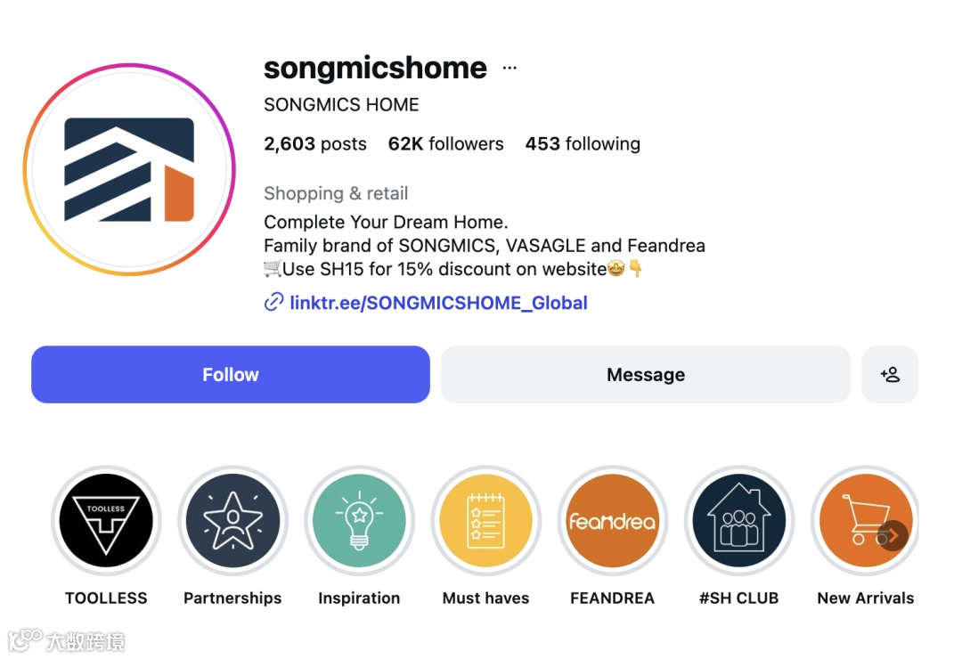 SONGMICS在各大主流社媒平台都布局了官方账号,其中效果最好的是Instagram。