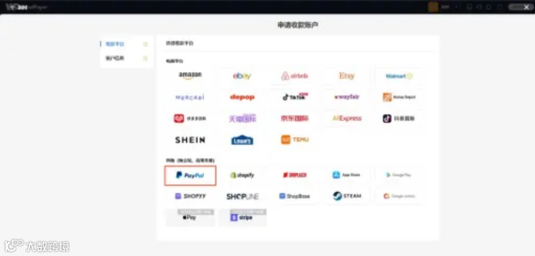 2.申请收款条目: 实名通过后,点击菜单栏的“平台收款”,选择 PayPal 进入申请流程。