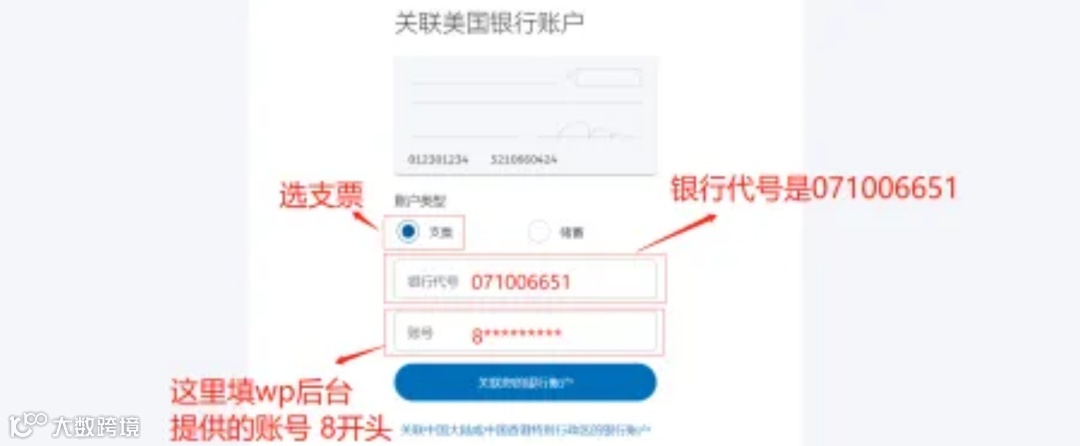 填写信息: 将第一步在 WindPayer 获取的账户信息(Routing Number / Account Number)对应填入。