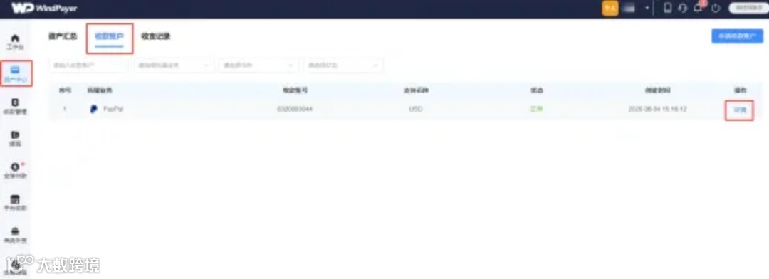 3.获取账号信息: 审核通过后,在“资产中心”➔“收款账户”➔“详情”中,你可以看到你的美国银行账号信息(包括行号、账号、账户类型等)。