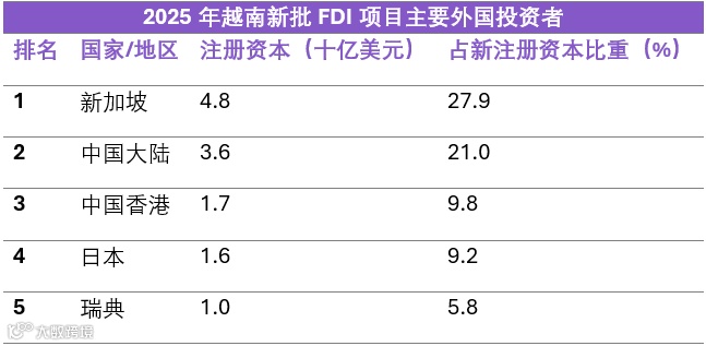 在新批FDI项目的90个投资来源国家和地区中,新加坡为最大投资国,其次为中国、中国香港、日本和瑞典,显示亚洲投资者仍占主导地位,同时欧洲参与度有所提升。
