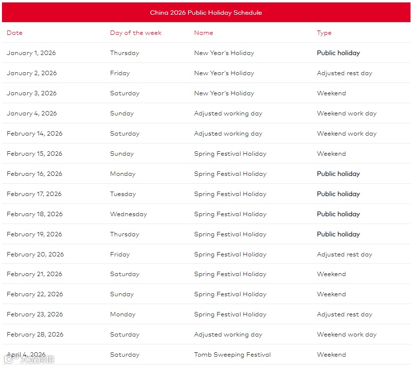 On November 4, 20205, the General Office of the State Council released the official public holiday calendar for 2026.